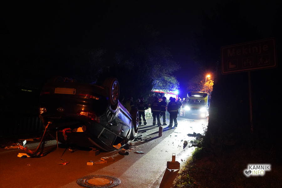 Včeraj zvečer, par minut pred 20. uro, so bile kamniške urgentne službe obveščene, da je na ovinku Neveljske poti pod Prašnikarijo v Mekinjah prišlo do prometne nesreče, v kateri se je osebno vozilo prevrnilo na streho.