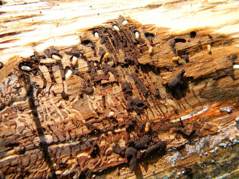 - črvina opečnato rjave barve, ki se na ležečem drevju nahaja v obliki kupčkov v okolici vhodnih odprtin na skorji drevesv (slika 3). V primeru napada stoječih dreves se črvina kopiči na koreninskem vratu in na pritalnem rastlinju v bližini napadenih dreves (po dežju ti znaki, ki niso opazni);