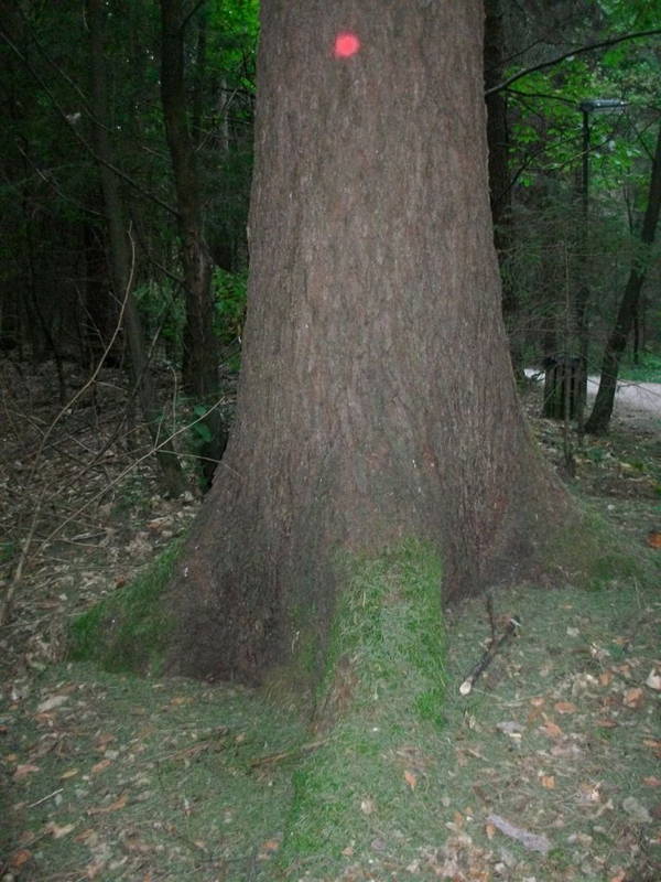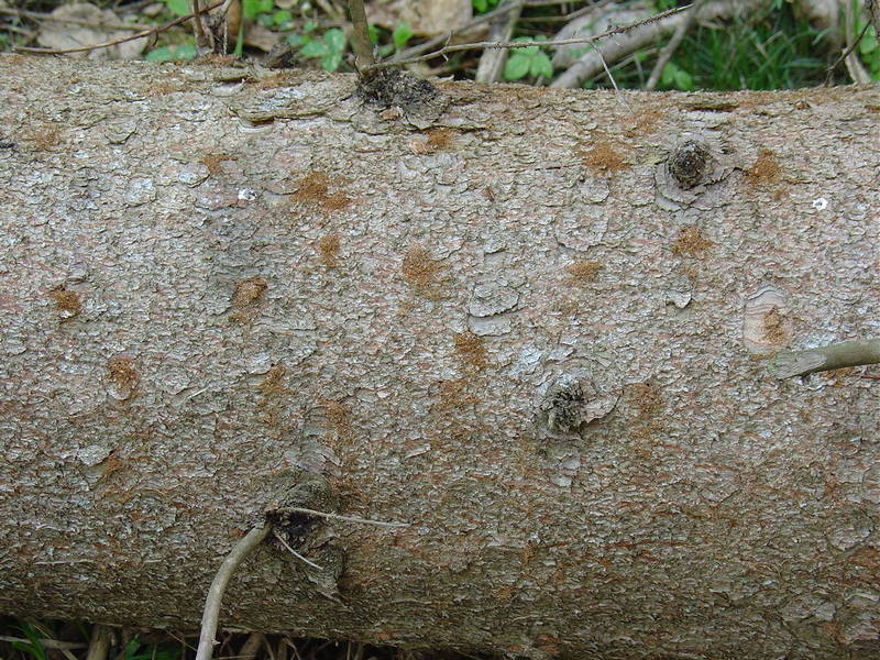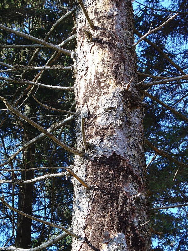 - odpadanje zelenih iglic(slika 6) in odstopanje lubja(slika 7) na deblu tik pod krošnjo. Ti znaki se lahko pojavijo že v poznem poletju in v jeseni, pogosto pa lubje prične odpadati šele čez zimo oziroma zgodaj spomladi (žolne pogosto kljuvajo skorjo napadenih dreves). Krošnja lahko vso zimo ostane zelena, čeprav je lubje že odpadlo z debla.