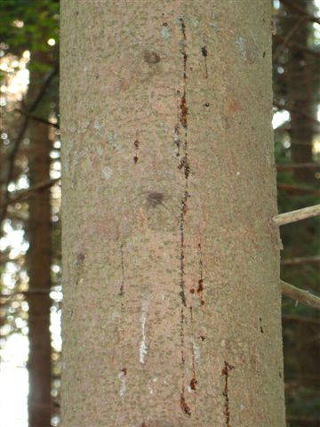 - ob vhodnih odprtinah se začnejo nabirati kapljice smole. Smola, ki se sčasoma strdi in postane belkasta, se včasih cedi po deblu (slika 4). V primeru napada osmerozobega smrekovega lubadarja se smoljenje najprej pojavi v zgornjem delu debla pod krošnjo;