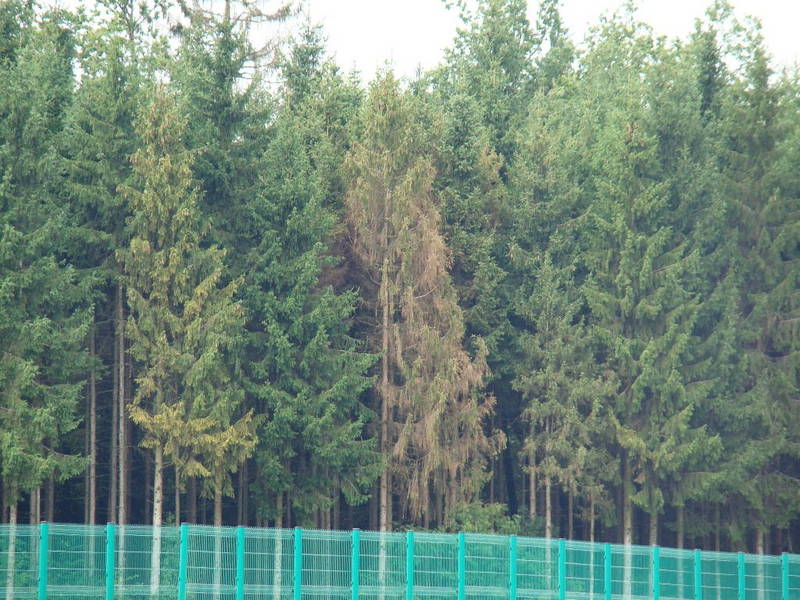 - rumeno-rjavodo rdeče obarvanje krošnje(slika 5), ki je značilno za spomladanski napad podlubnikov;
