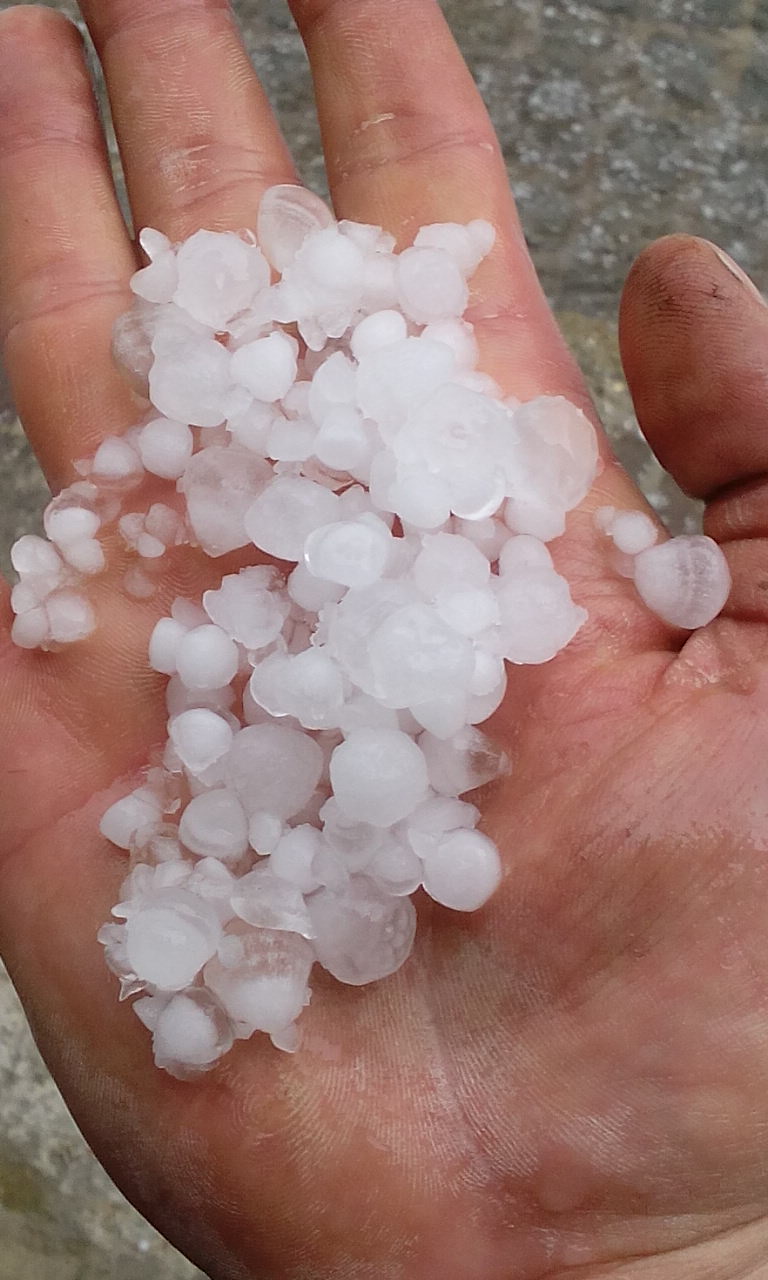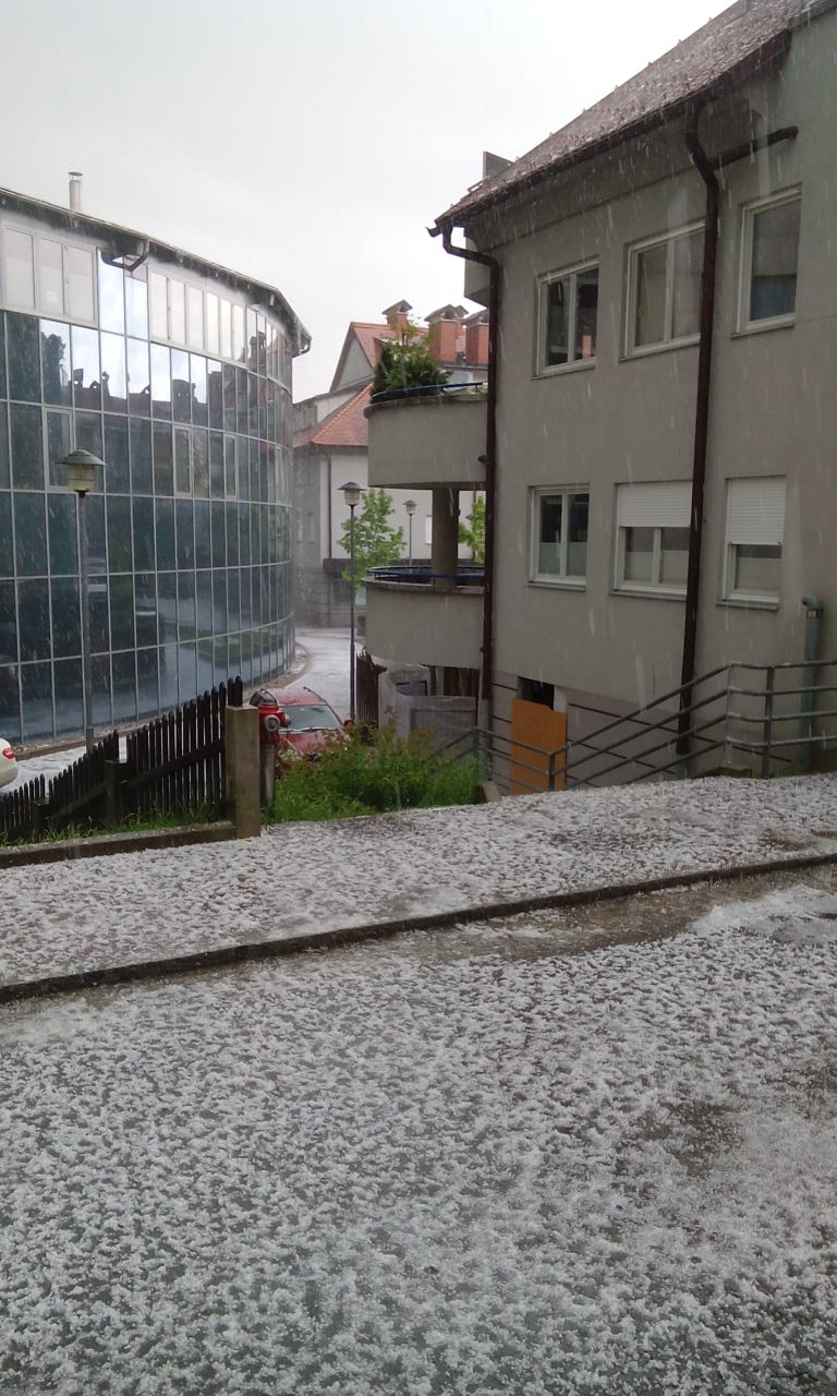 Kar precej debela toča, ki je padala v centru Kamnika – k sreči je toča padala na precej ozkem območju okolice središča mesta – sicer ni povzročila večje škode na avtomobilih in objektih, zagotovo pa bodo precejšno škodo utrpeli vrtovi in sadno drevje, ki jih je prizadela že nedavna pozeba.