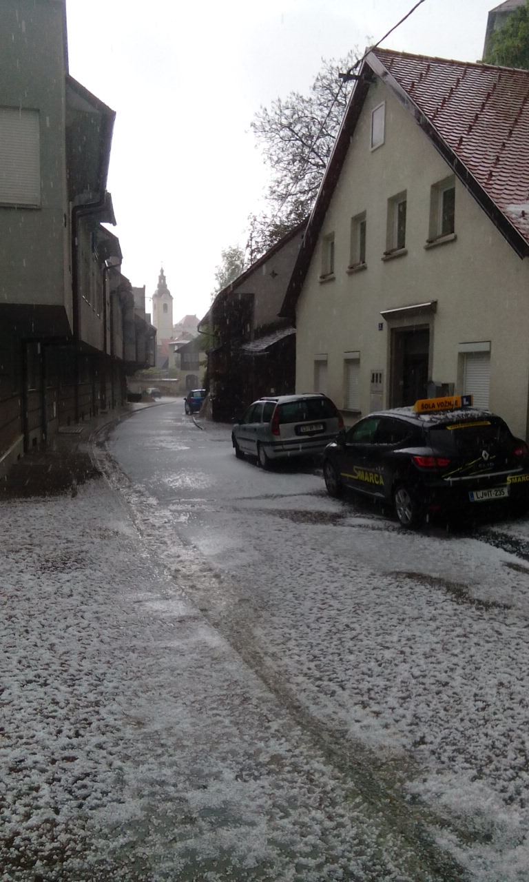 Bolj aprilsko kot majsko vreme letos ne prizanaša, kajti Kamnik je danes zajela močna nevihta s točo, ki je kot sneg prekrila kamniške ulice.