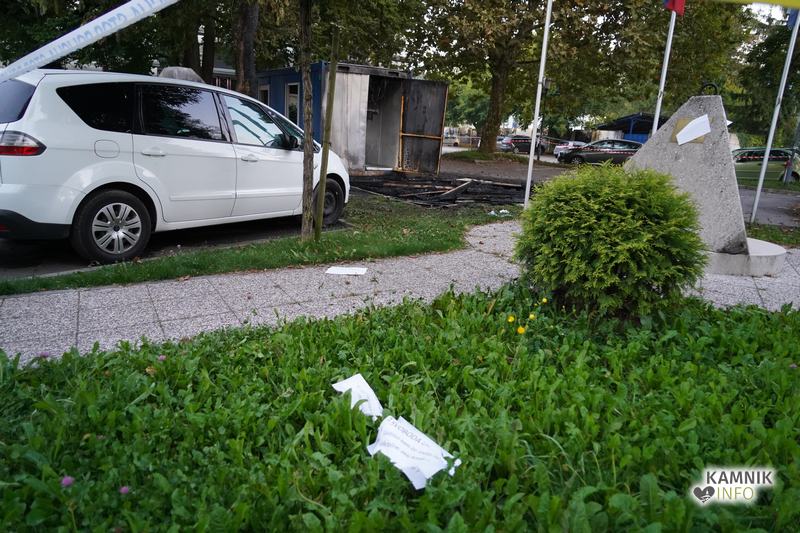 Neznani storilci so ponoči pri Domu kulture v Kamniku zažgali kamniško COVID-19 testno točko, ki jo je požar povsem uničil. Ognjeni zublji so poškodovali tudi tri v bližini parkirana vozila, da gre za požig pa ni nobenega dvoma, saj je v bližini pogorišča moč najti oz. videti tudi letake s pomenljivo vsebino.