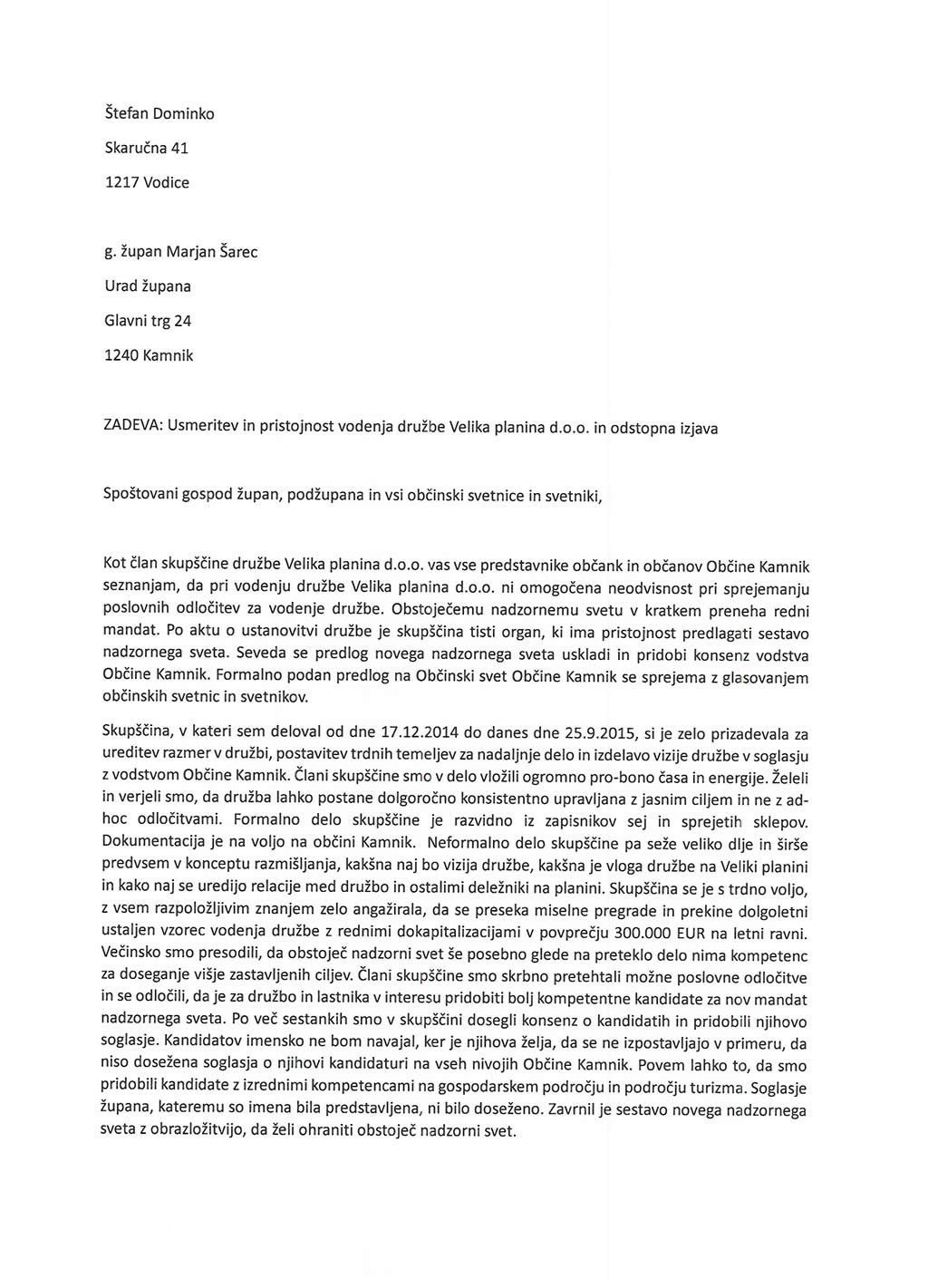 Kot razlog za svoj odstop iz skupščine podjetja Dominko, v svojem obširnem odstopnem pismu, navaja: »…da pri vodenju družbe Velika planina d.o.o. ni omogočena neodvisnost pri sprejemanju odločitev za vodenje družbe.« ter doda: »Obstoječemu nadzornemu svetu v kratkem preneha redni mandat. Po aktu o ustanovitvi družbe je skupščina tisti organ, ki ima pristojnost predlagati sestavo nadzornega sveta. Seveda se predlog novega nadzornega sveta uskladi in pridobi konsenz vodstva Občine Kamnik.«