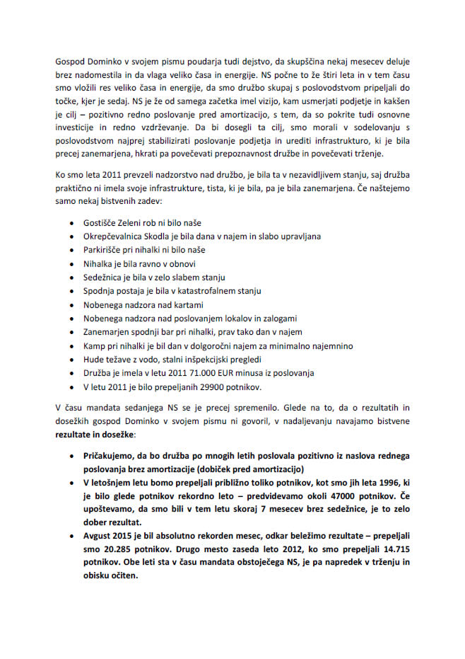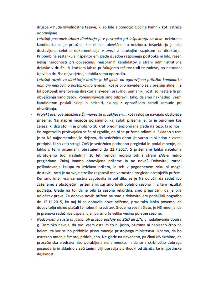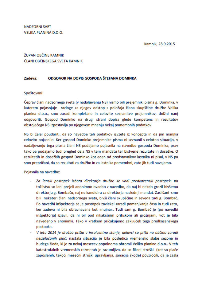 Podrobnosti o očitkih in odgovorih nanje, pa si lahko, tako v odstopni izjavi Štefana Dominka, kot v odgovoru Nadzornega sveta družbe Velika planina d.o.o, preberete sami. Obe obširni pisanji sta bili poslani tako vodstvu občine, kot tudi kamniškim svetnikom in svetnicam, zato je najbrž prav, da ste z njima seznanjeni tudi občani, ki vse skupaj financirate.