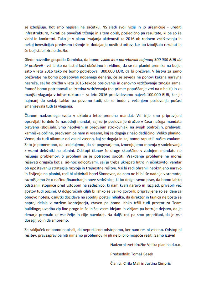 Na očitke Štefana Dominka so se, nič manj obširno, odzvali tudi člani obstoječega nadzornega sveta družbe, ki se v svojem odgovoru niso pozabili pohvaliti z rezultati minulega dela, le-teh se je nenazadnje nabralo kar nekaj, za nameček, pa jim gredo na roko tudi odlični rezultati letošnje poletne sezone, ki je bila rekordna. Člani nadzornega sveta, ki so mimogrede vsi tudi prebivalci kamniške občine, niso pozabili navesti niti prihodnjih načrtov razvoja Velike planine, ki so sicer smeli, ampak z nekaj sreče najbrž tudi realno izvedljivi, še posebej, če Velika planina v prihodnje zares začne poslovati brez izgube, kar sicer še ne pomeni, da v prihodnje ne bo več potrebovala pomoči občine, bo pa ta najbrž precej manjša, kot do sedaj. To sicer ne odpravlja vseh težav povezanih z Veliko planino, vseeno pa predstavlja precejšen premik na bolje, oz. kot so zapisali člani nadzornega sveta v odgovoru na očitke Štefanu Dominku: »Glede navedbe gospoda Dominka, da bomo vsako leto potrebovali najmanj 300.000 EUR da bi preživeli – vsi lahko na lastni koži občutimo in vidimo, da se na planini premika na bolje, zato v letu 2016 tako ne bomo potrebovali 300.000 EUR, da bi preživeli. V bistvu za samo preživetje ne bomo potrebovali nobenega denarja, če se seveda ne ponovi kakšna naravna nesreča, saj bo družba v letu 2016 tekoče poslovanje in osnovno vzdrževanje zmogla sama. Pomoč bomo potrebovali za izredna vzdrževanja (na primer popuščanje vrvi na nihalki) in za manjša vlaganja v infrastrukturo – za leto 2016 predvidevamo največ 100.000 EUR, kar je najmanj do sedaj. Lahko pa povemo tudi, da se bodo z večanjem poslovanja počasi zmanjševala tudi ta vlaganja.«