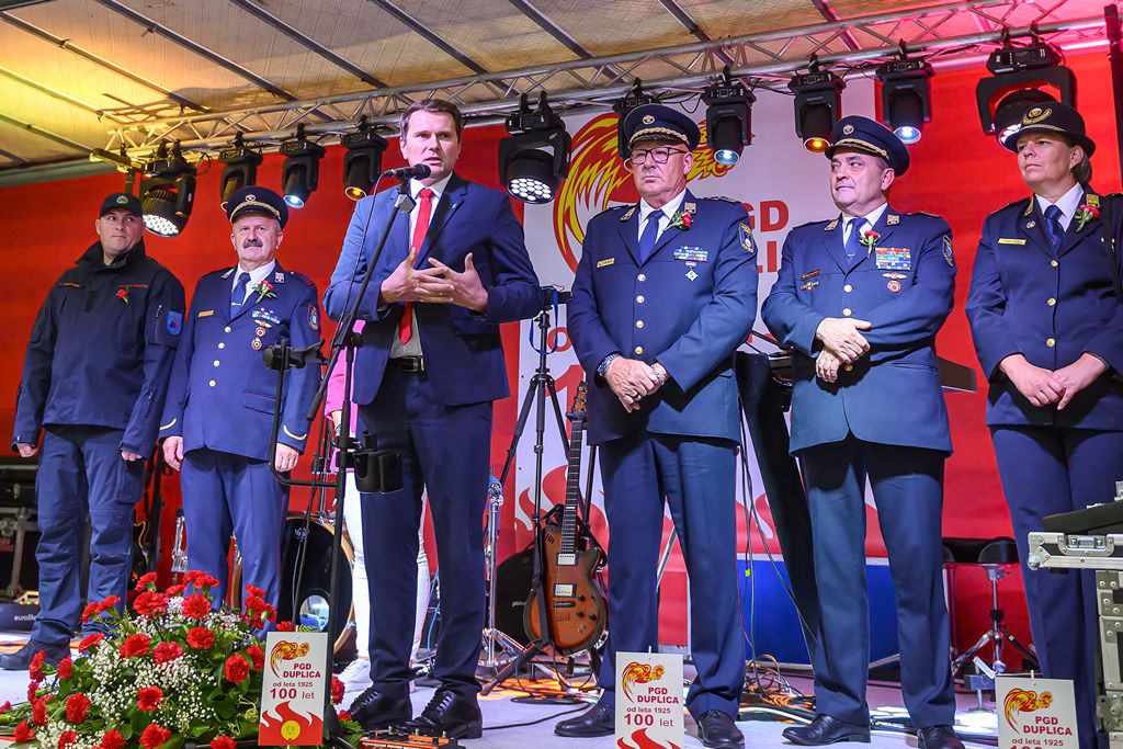 Župan Matej Slapar je v svojem nagovoru poudaril ponos in hvaležnost, ki ju občina čuti do dupliških gasilcev. Ob tem je izpostavil našo neprecenljivo vlogo pri zaščiti in reševanju tako doma kot širše po Sloveniji – od naravnih nesreč do osamosvojitvene vojne, pa tudi pomemben prispevek k športnemu, kulturnemu in družabnemu življenju kraja. Posebej je pohvalil našo solidarnost in požrtvovalnost v času velikih poplav leta 2023 ter poudaril, da gasilci vse delo opravljamo prostovoljno, iz srca, za skupnost. Ob koncu je župan gasilkam in gasilcem PGD Duplica namenil iskrene čestitke ter izrazil podporo njihovemu novemu cilju – izgradnji sodobnega gasilskega doma, ki bo omogočil še učinkovitejše delo in nadaljevanje bogate tradicije.