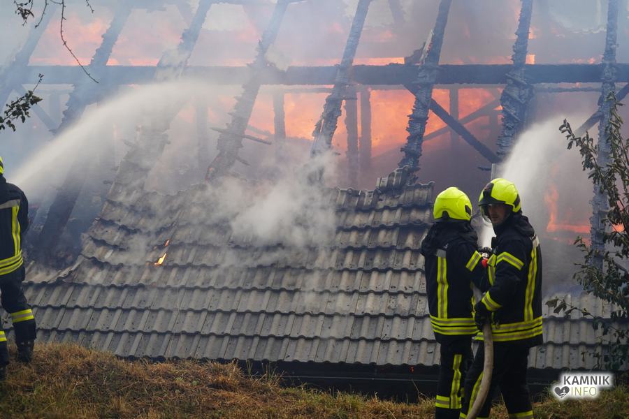 Požar, ki je iznenada zajel domala celotno poostrešje gospodarskega objekta, polno suhega sena, se je zelo hitro razplamtel in se razširil na celo ostrešje in objekt, k sreči pa so domači in sosedje ter gasilci s hitrim posredovanjem preprečili, da bi se ognjeni zublji v strnjenem naselju razširili še na bližnje sosednje objekte.
