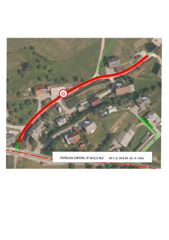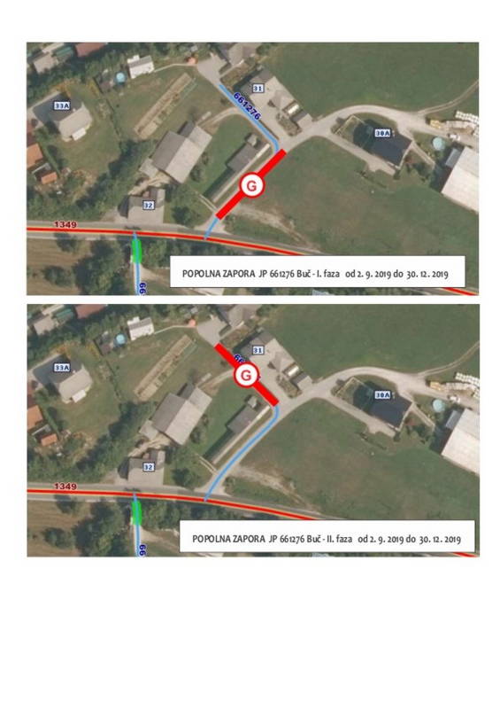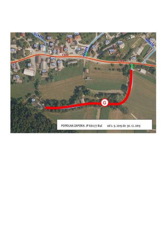 - gradnje kanalizacije (kohezija) , popolna zapora javnih poti JP 661275 Buč, JP 661276 Buč in JP 661277 Buč v času od 2. 9. 2019 do 20. 12. 2019.