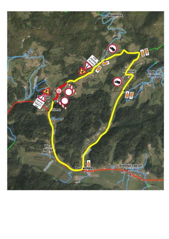 V času popolne zapore bo potekal obvoz za osebna vozila v smeri Markovo – Rožično – Podhruška – Markovo in obratno. Na delu javne poti JP 661132 Markovo-Rožično se bo zaradi širine cestišča, ki ne dopušča dvosmernega prometa urejal promet s semaforjem. Obvoz za tovorna vozila bo potekal v smeri Markovo – Studenca – Podlom.