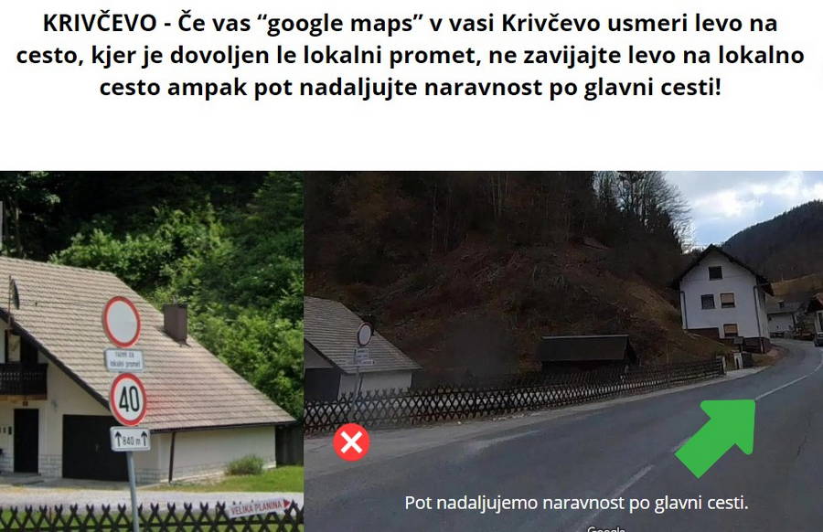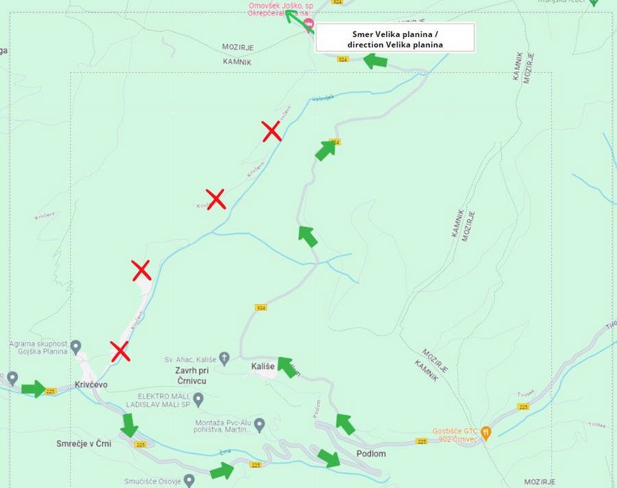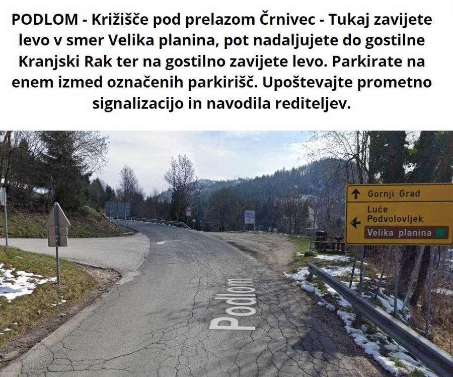 Pri uporabi “google mapsa” bodite pazljivi, predvsem tisti, ki prihajate s smeri Kamnika, saj vas le ta občasno pelje po napačni poti, skozi vas Krivčevo. Gre za cesto, kjer je vožnja dovoljena le za lokalni promet, torej prebivalce vasi. Cesta v določenem delu niti ni prevozna za osebna vozila. Če vas “google maps” odpelje na to pot, ob križišču za vas Krivčevo pot nadaljujte naravnost po glavni cesti in pod vrhom prelaza Črnivec zavijte levo na cesto Podlom – Kranjski Rak. Ob križišču se tudi nahaja tabla, ki vas usmeri proti Veliki planini. Prosimo vas, da upoštevate prometno signalizacijo, da zagotovimo nemoten dostop prebivalcem vasi do svojih domov ter da zagotavljamo dostop za intervencijska vozila.