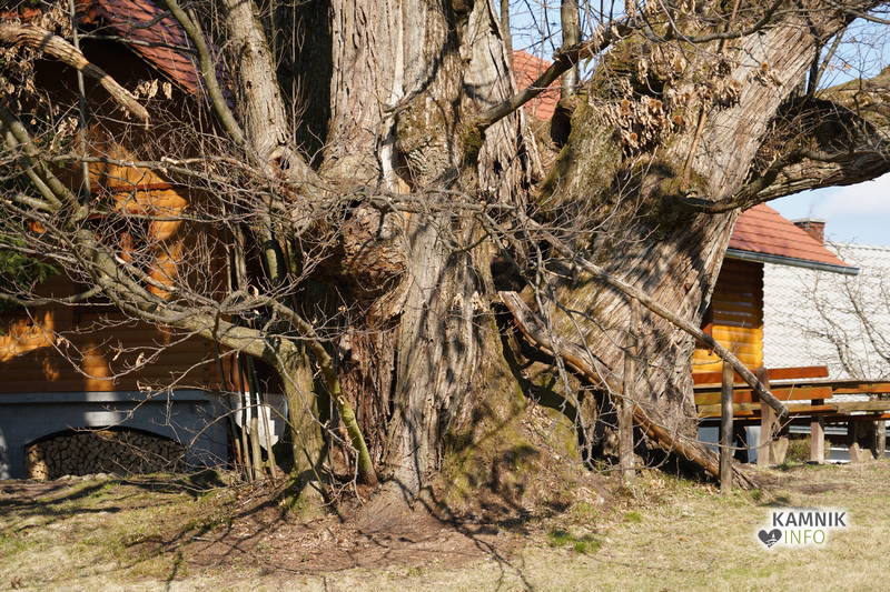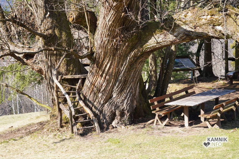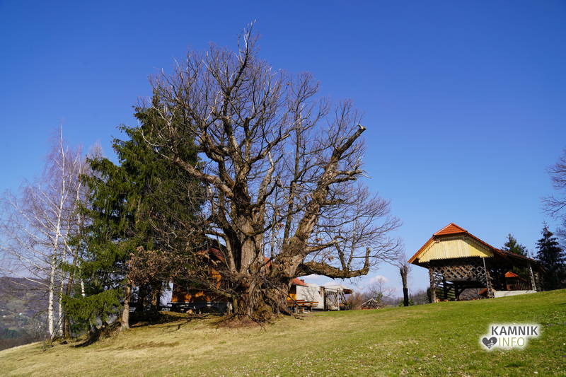 Mogočni kostanj, ki poleti pod svojo krošnjo nudi prijetno senco, trenutno sicer še ni olistan, vseeno pa je vreden ogleda, saj bi bili za objem njegovega debla potrebni vsaj kaki dve družini s precej naraščaja.