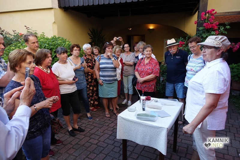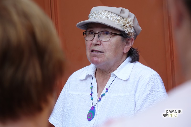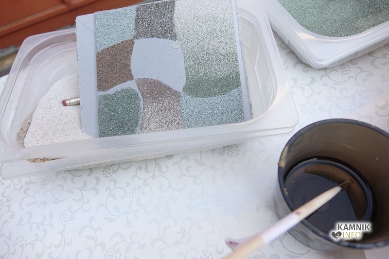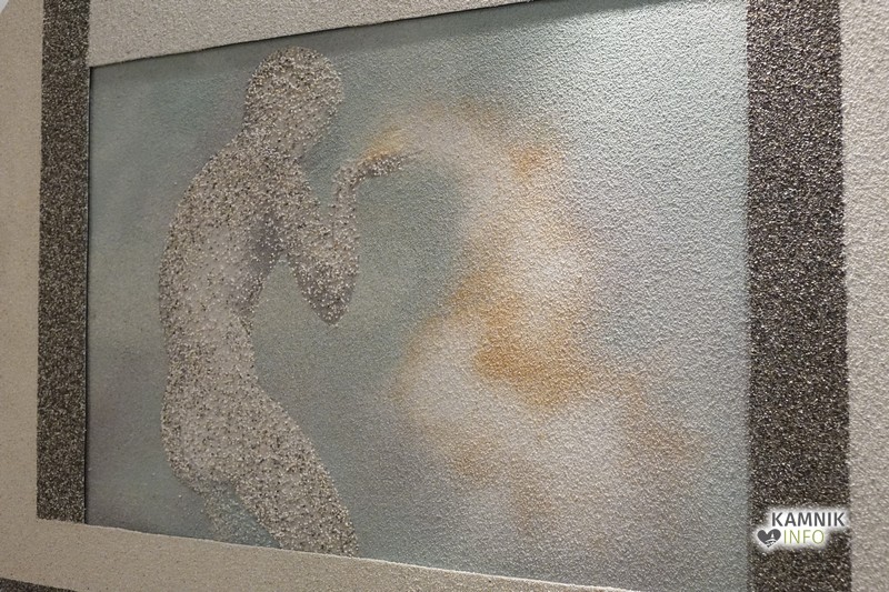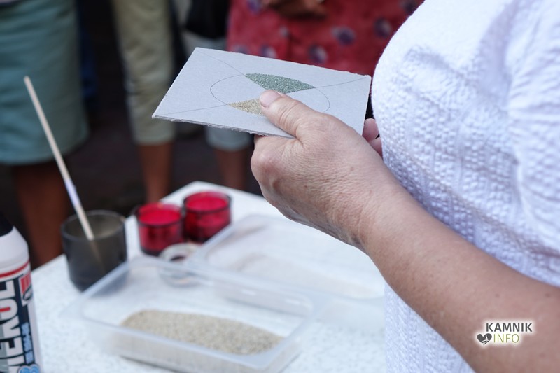 Umetnica iz Baške Grape je obiskovalce po kratkem uvodu in nekaj prav prisrčnih anekdotah povabila na vrt galerije Dike, kjer je pokazala kako slika iz peska pravzaprav nastane. Sama pravi, da vsakomur ki ga zanima zelo rada pokaže postopek in tehnike, vendar pa je še vedno edina v Sloveniji, ki se s to umetnostjo aktivno ukvarja; ta tehnika namreč zahteva ne le umetniško žilico, temveč tudi obilo potrpljenja, poznavanja geoloških raznolikosti Slovenije in nasploh tudi fizičnega truda.