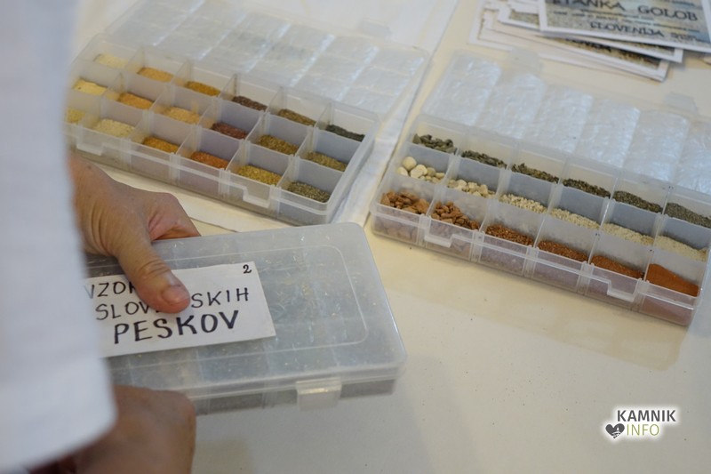 Stanka Golob pripravi vse materiale sama, kar pomeni potovanja po Sloveniji, raziskovanje kamnolomov in rek, dostavo peska in sejanje ter sortiranje. Za vsako od šestdesetih različnih barv peska točno ve, kje ga najde. Pesek različnih debelin dvodimenzionalni površini doda prostorsko globino njenim tako realističnim kot geometričnim slikam.