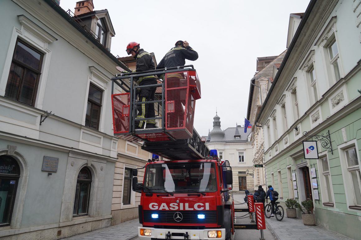 Vrli gasilci PGD Kamnik so najprej začasno zaprli cesto, nato pa, s pomočjo gasilske avto-lestve in mačjo spretnostjo, kaj hitro na novo namestili zrahljane strešnike oz. nekaj bobrovcev odstranili ter s tem poskrbeli za odstranitev preteče nevarnosti, tako da se lahko skozi središče Kamnika znova spokojno sprehodite tudi brez čelade.