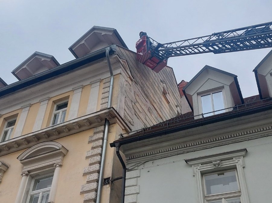 Gasilci so s stavbe kamniškega hrama pravice odstranili nekaj zrahljanih strešnikov, ki so grozili, da padejo na glavo kakemu nič hudega slutečemu občanu.
