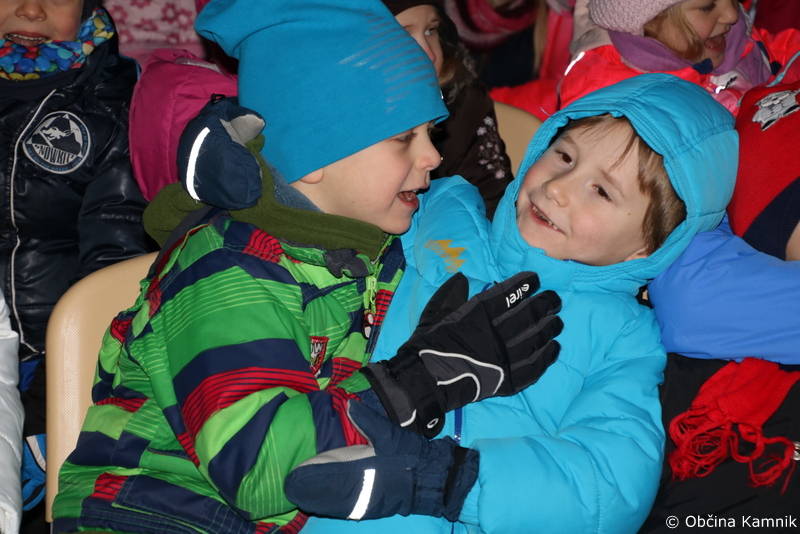 V izvedbi gledališke skupine in Otroškega pevskega zbora Vrtca Antona Medveda Kamnik smo prisluhnili glasbeni pravljici »Plamen prijateljstva« in tudi letos priklicali enega izmed treh dobrih mož, ki nas obiskujejo v decembru, dedka Mraza, ki je skupaj s številnimi družinami prisluhnil še plesni in glasbeni točki dijakinj in dijakov Gimnazije in srednje šole Rudolfa Maistra Kamnik.