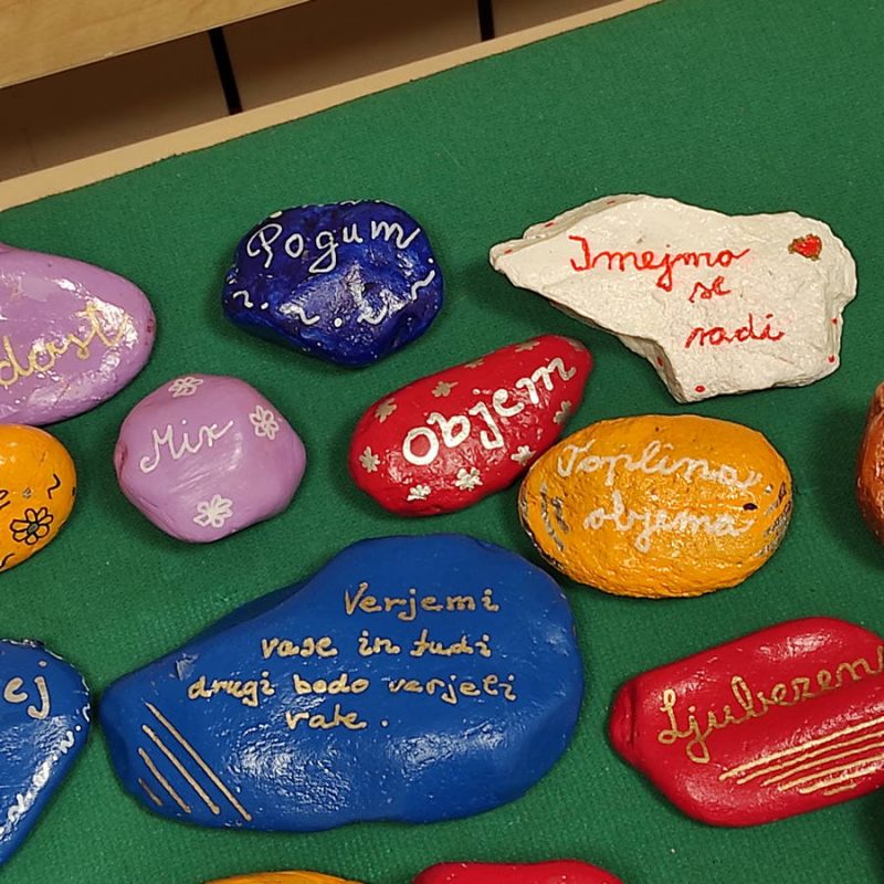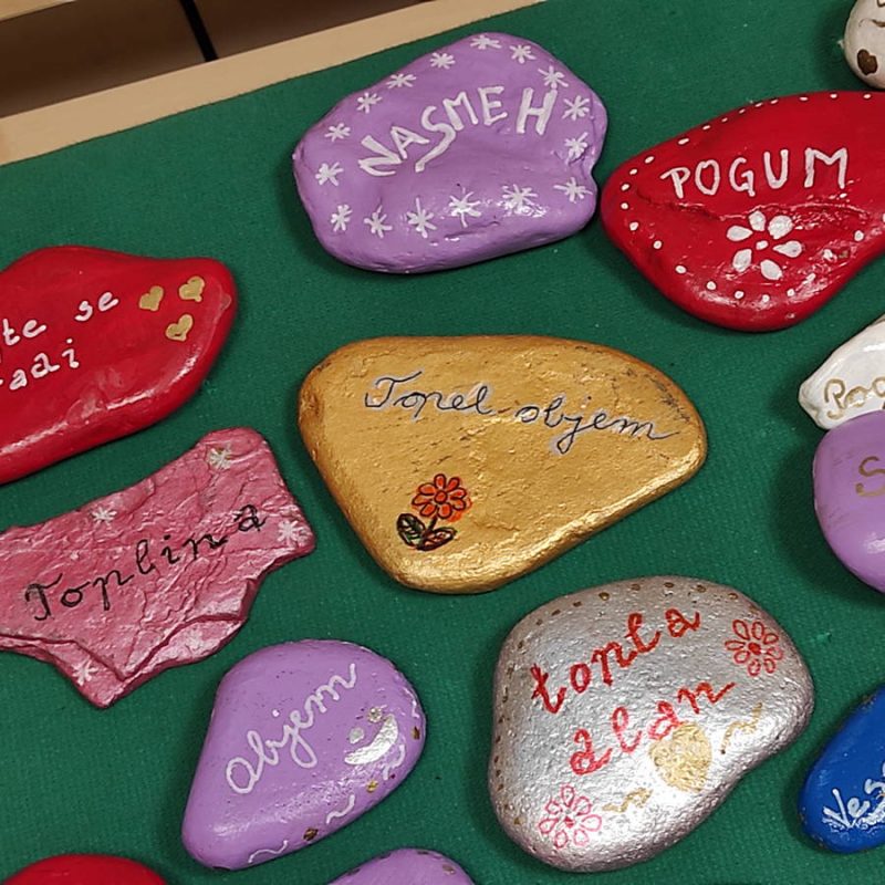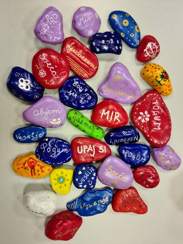Otroci so v vrtec prinesli kamenčke ter jih pobarvali in okrasili, vzgojitelji pa so nanje zapisali lepe besede in prijazne misli. Vsak kamenček je drugačen in vsak ima svoje sporočilo.