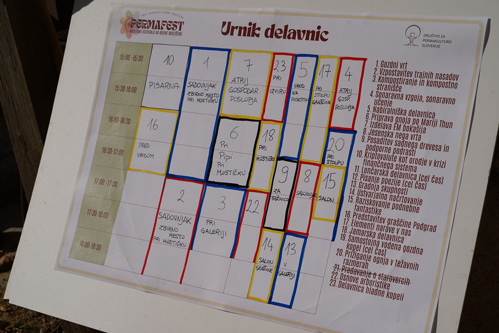 Po začetnem nagovoru so strokovnjaki z vseh sedmih permakulturnih področij (Telesno in duhovno blagostanje, Oskrbništvo posesti in narave, Pravica do posesti in skupnostno upravljanje,