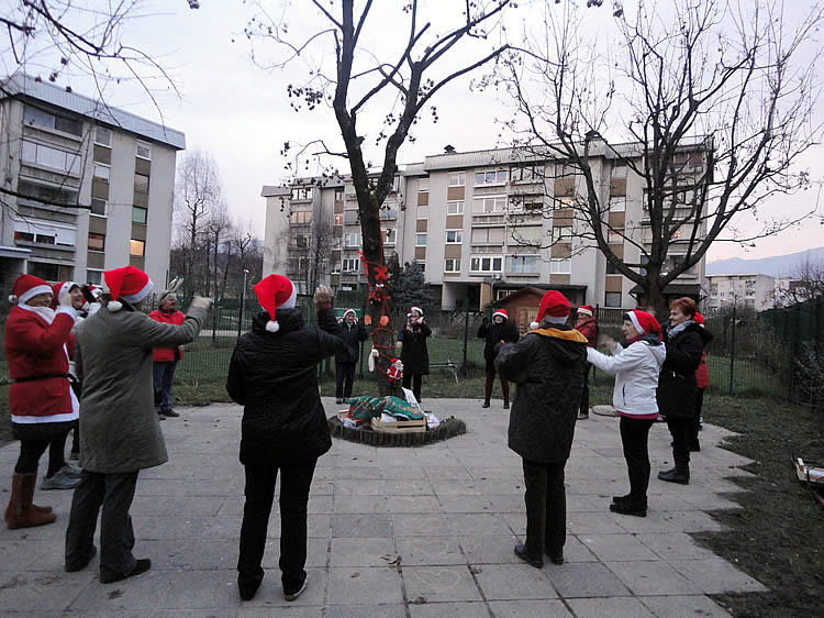 Včasih poskrbimo tudi za posebna jutra… Jutro z Anino zvezdico, s sv. Miklavžem, z Božičkom, s Heleno,… Vsako jutro, novo jutro, vsako drugače lepo, … Včasih občudujemo še luno, ki se v teh dolgih zimskih nočeh, kar noče posloviti; včasih nam zarja s Kamniških planin obeta lep sončen dan, včasih nam dežne kaplje in snežinke drsijo po razgretih licih … Naše golo drevo sredi igrišča smo odele in okrasile v oranžno in po svoje zažari, ko ga vsako jutro »objamemo« (obkrožimo) z jutranjim pozdravom.