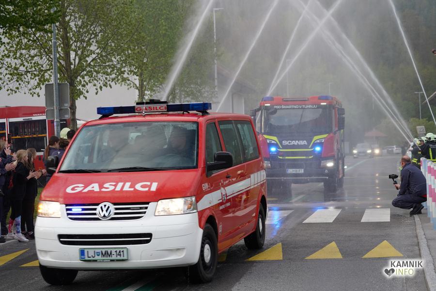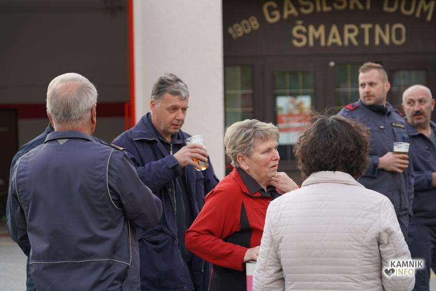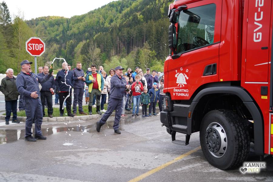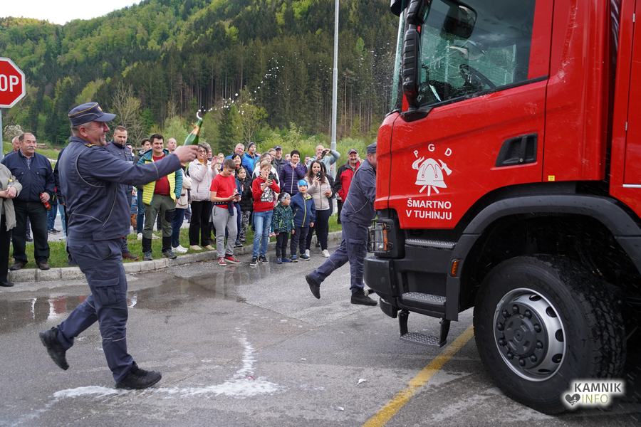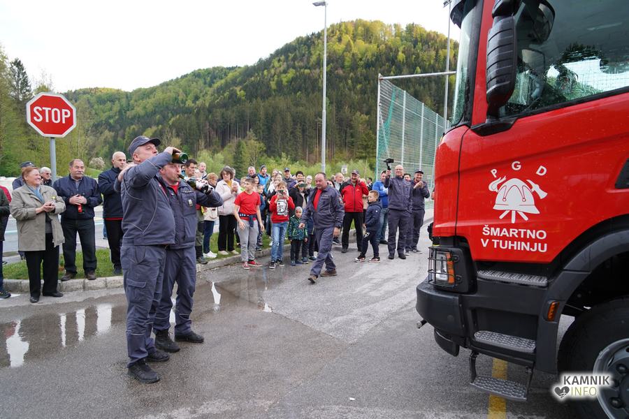 Ob prihodu nove cisterne, ki so jo domači gasilci pričakali s slavnostnim vodnim špalirjem, ter simbolični častni vožnji skozi domači kraj, sta zbrane čisto na kratko nagovorila Igor Žavbi, predsednik, ter Tone Klemen, poveljnik PGD Šmartno v Tuhinju, ki sta pred tem novo cisterno tako izdatno zalila s krstno penino, da jima je v steklenicah na koncu ostalo komajda za požirek več kot zaslužene zdravice.