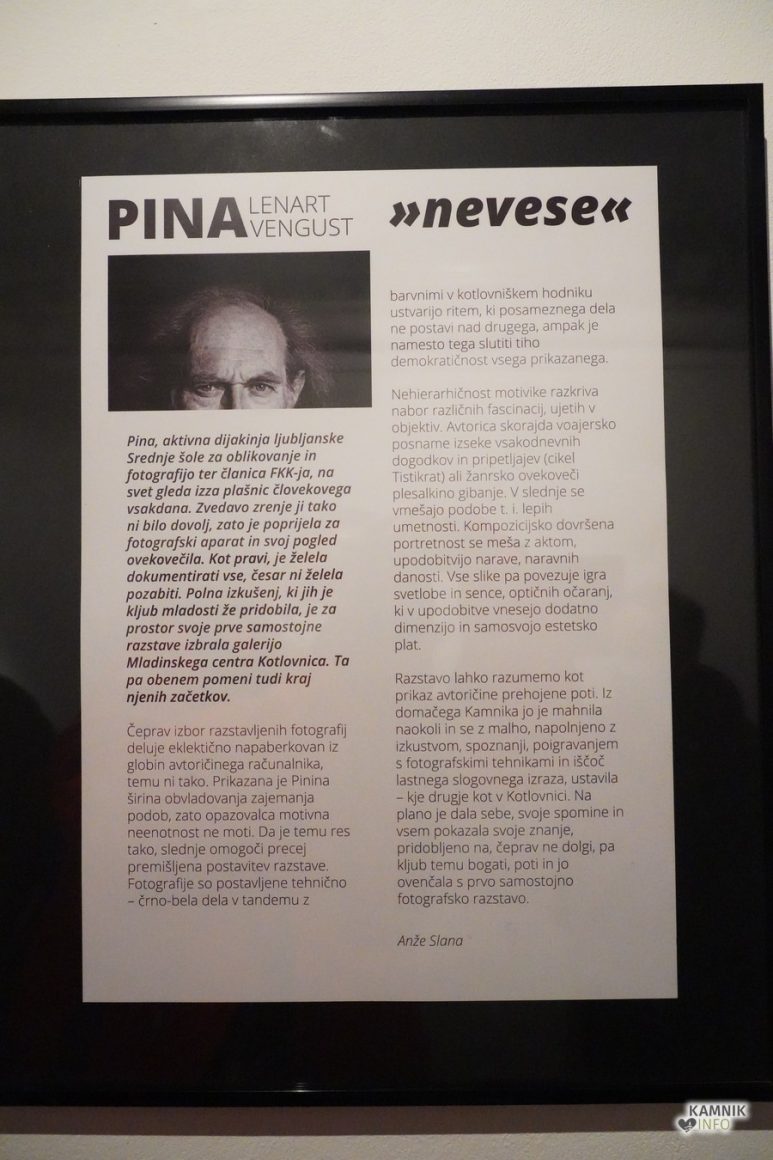 V Mladinskem centru Kotlovnica, v kateri je priložnost za predstavitev v zadnjih nekaj letih dobila že vrsta mladih lokalnih ustvarjalcev, se je nocoj, s svojo prvo samostojno razstavo fotografij, predstavila nadebudna kamniška fotografinja Pina Lenart Vengust, ki svojega fotografskega znanja ne pili zgolj kot dijakinja Srednje šola za oblikovanje in fotografijo, ampak tudi kot ena najmlajših, najbrž pa tudi bolj zagnanih članic Foto kluba Kamnik.