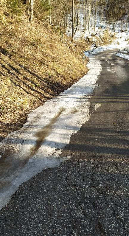 In nihče (od zato odgovornih) ne pogleda, če je to res potrebno, saj je za cesto skoraj povsod narejena drenaža. Potrebna je le motika, lopata. Nekajkrat se zajame in na šoder naložen mulj odvrže v breg – naredi se mala luknja in voda teče v drenažo … ne na muldo, ne po cesti, ni potrebno nametovanje soli za okolje, živali in ljudi škodljive.