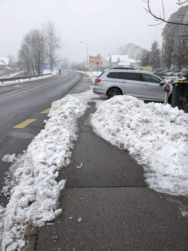 Pri pošti je še posebna izkušnja, če se najde kakšen “fajn” voznik, ki parkira na koncu avtobusne postaje in s tem še dodatno oteži umik. Na križišču pri Groharjevi pa kup snega blokira prehod do zebre – predvidevam da je to tudi šolska pot za kar nekaj otrok.