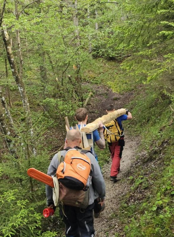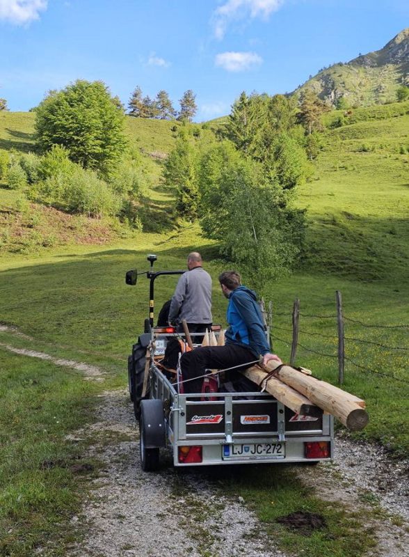 Za izgradnjo in postavitev novega mostu so morali udeleženci sobotne delovne planinske akcije najprej ves material in orodje v bližino, kolikor daleč je pač šlo, pripeljati s traktorjem, nato pa, kar lep zalogaj poti, prinesti na lastnih plečih.