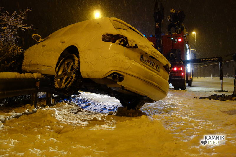 Na dodobra zasneženi kamniški obvoznici je nekaj pred 22. uro prišlo do prometne nesreče, v kateri je mlajši voznik osebnega vozil znamke Audi pristal na odbojni ograji.