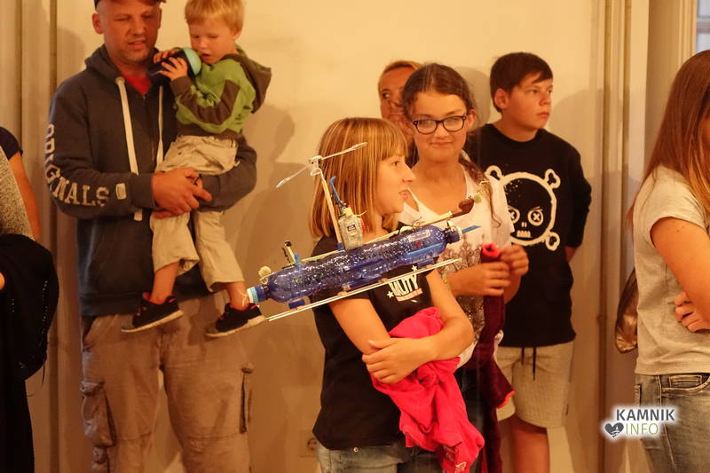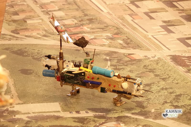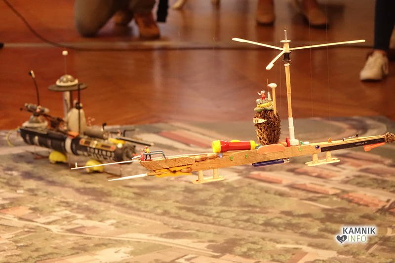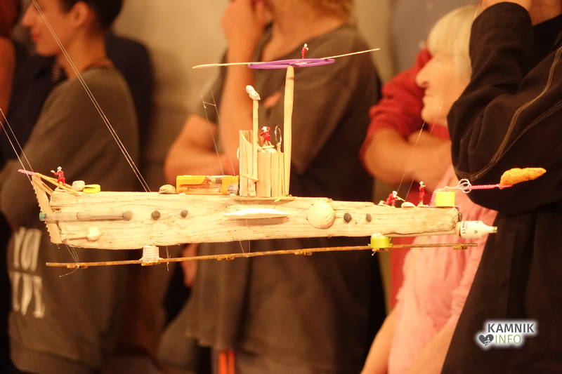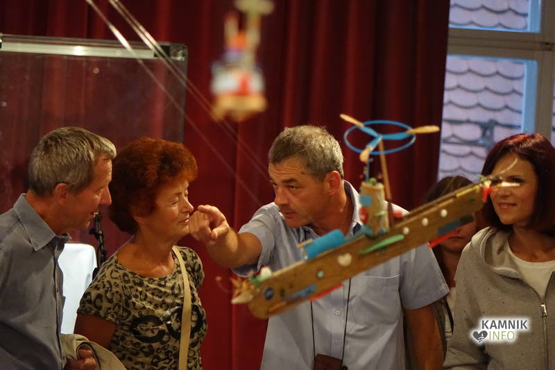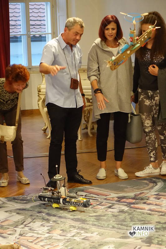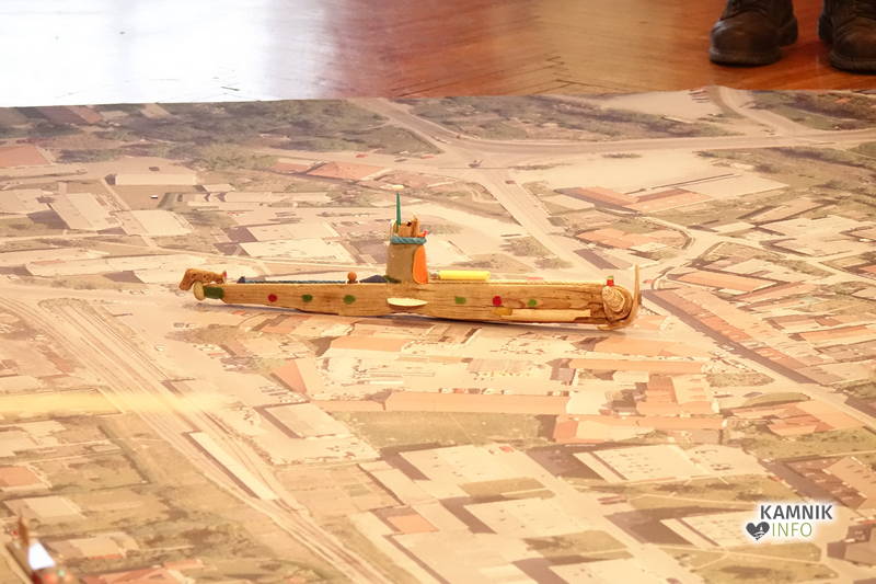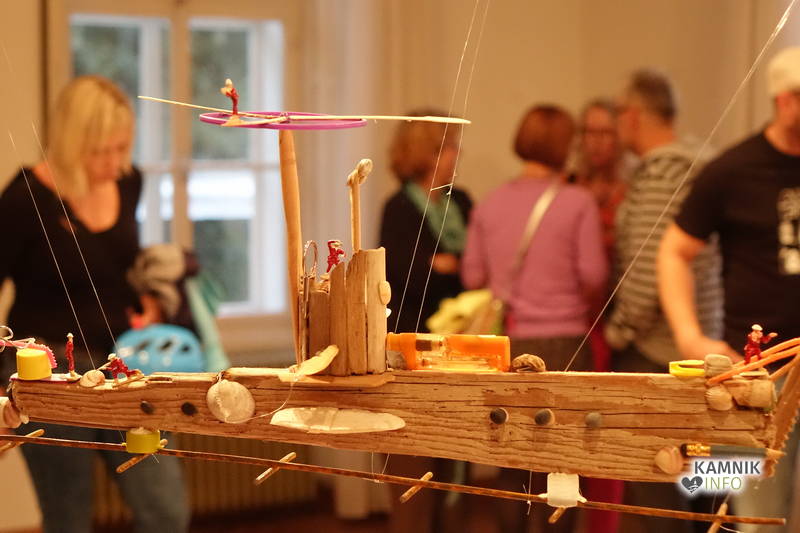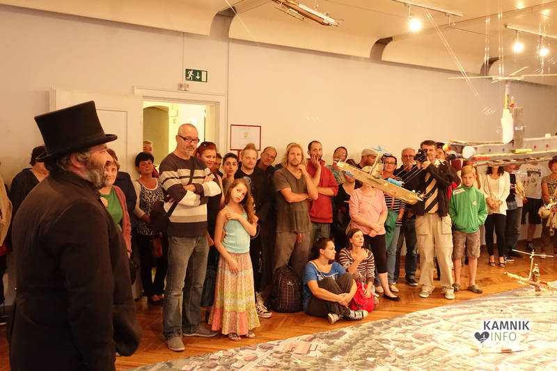 Reciklirane eco-art različice mističnega plovila kapitana Nema je v ustvarjalni (nev)ihti Andreja Schlegla sinoči izvrglo nad simbolično jezersko dno potopljenega Kamnika, ki ga ponazarja preproga fotografije mesta iz ptičje perspektive, nad katerim plovejo podmornice, medtem ko je obiskovalcem odprtja razstave, ne da bi se tega sploh zavedali, pripadlo mesto planktona in zlatih ribic oziroma, ali če morda pogledamo skozi z algami poraslo šipo skafandra občinskih kulturnih potapljačev, spužev, kalamarov, meduz in nosečih morskih konjičkov.