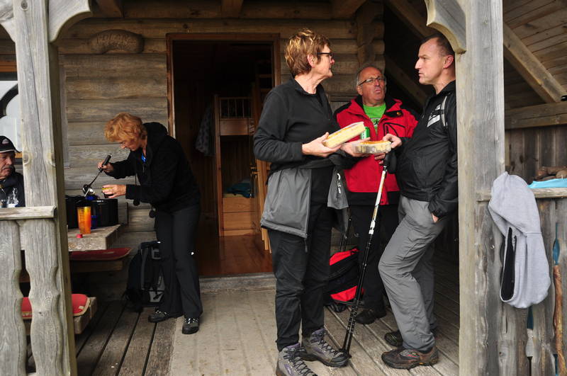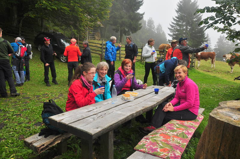 Z vrha je sledil spust na planino Travnik, kjer sta nas v svojem pastirskem stanu pričakala domačina iz Zg. Tuhinja Janez in Irena Pirš ter nam ponudila okrepčilo. Po daljšem postanku in prijetnem kramljanju je sledil še spust do lovske koče LD Tuhinj. kjer nam so nam člani športnega društva prav tako pripravili okrepčilo. Iz lovske koče so se nato pohodniki spustili nazaj do izhodišča in odšli vsak svojo pot, nekateri z gobami drugi brez, vsi pa na srečo brez videnega medveda.