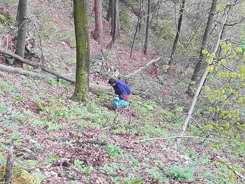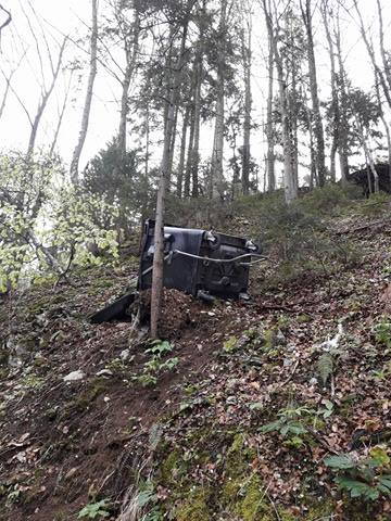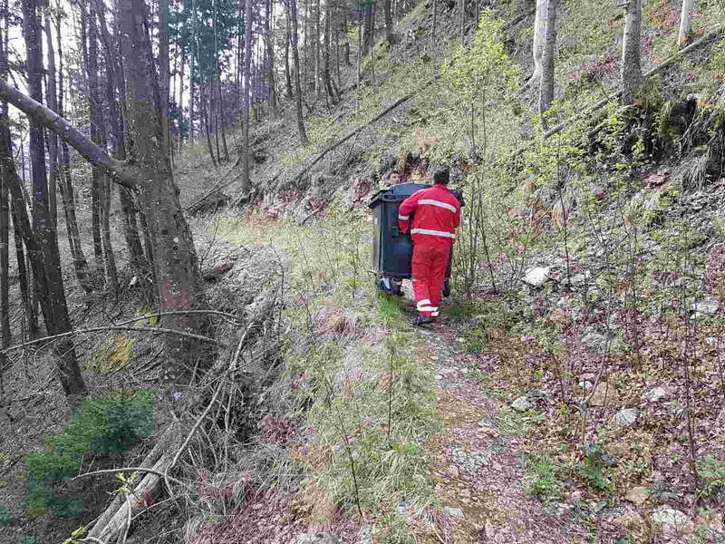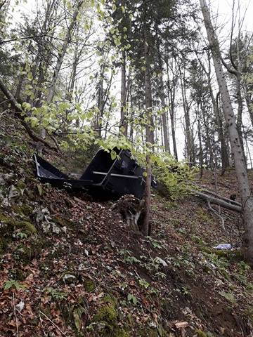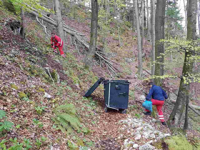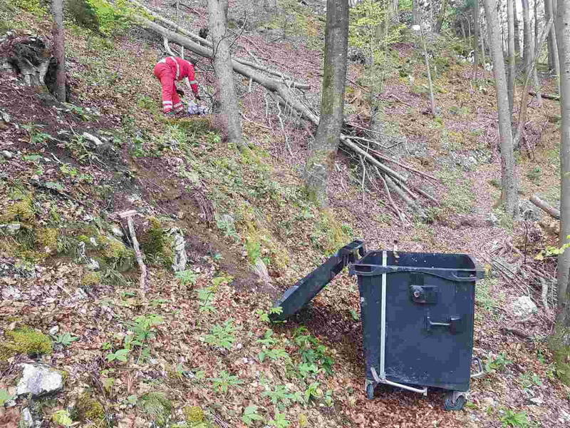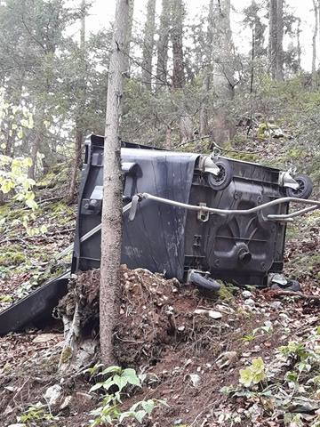 Pred dnevi je bralka našega portala Violeta Vozlič na gozdni oz. planinski poti pri Brezjah nad Kamnikom opazila, da je nekdo globoko v gozd oz. po bregu porinil veliko posodo za odpadke, v kateri so bile za nameček tudi smeti.