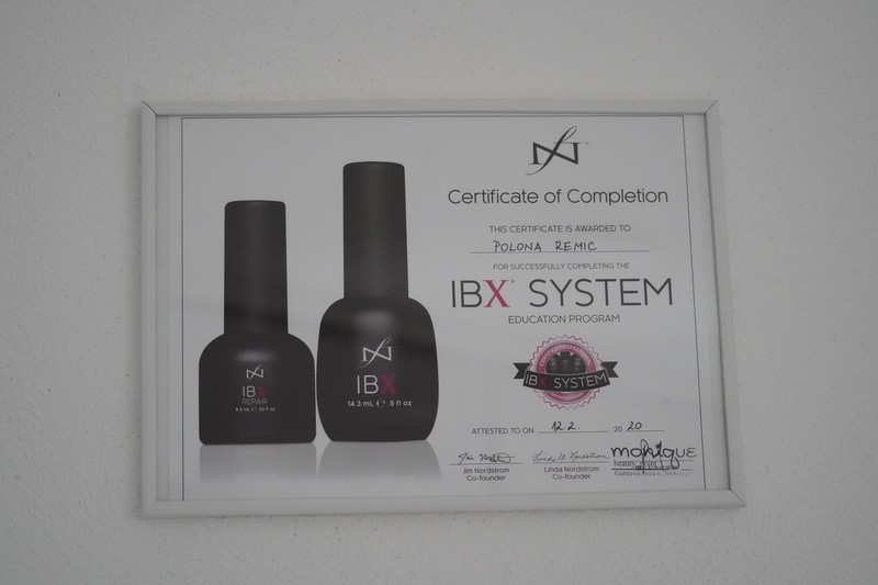 UTRJEVANJE NOHTOV z novim IBX sistemom utrjevanja nohtov. Sistem IBX je nova tehnika za popolno nego in zaščito šibkih, zlomljenih, razcepljenih ali kako drugače poškodovanih nohtov, ki s toploto in ultravijolično svetlobo, skupaj z mešanico naravnih olj jojobe in avokada, prodre v notranjost nohta in ga utrdi.