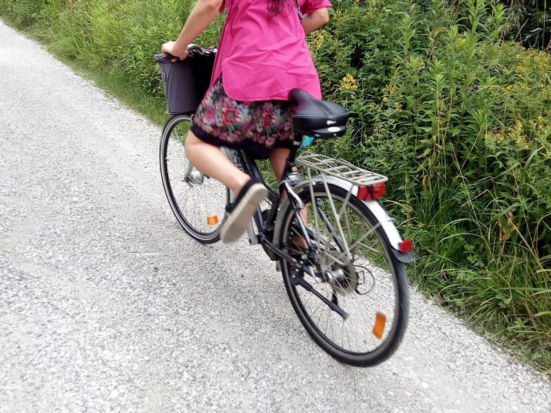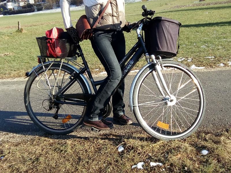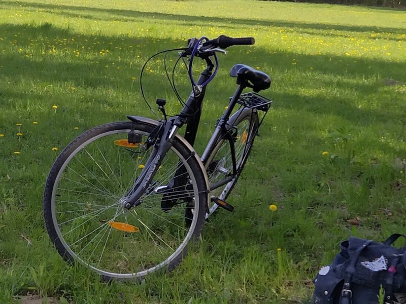 - črno-sivo, ki ga zaznamuje z zadnje strani poškodovan sedež. Drog je nizko spuščen, na balanci je nastavek za košaro in čelna svetilka, na prtljažniku pa rdeča elastika – večine verjetno ni več na kolesu.