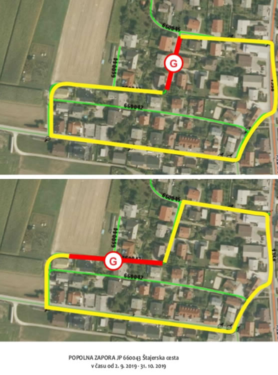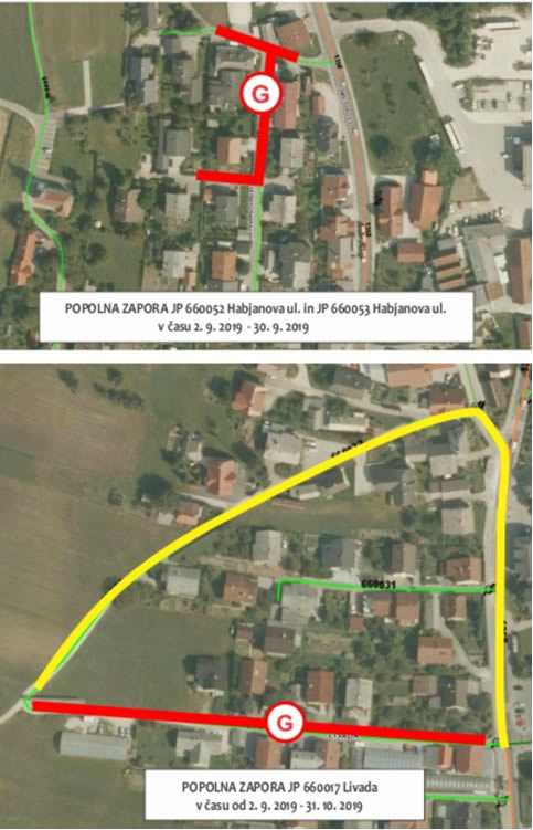 Zapora bo v času od 2. 9. 2019 do 31.10. 2019. Na Štajerski ulici in Livadi bo urejen obvoz, na Habjanovi ulici ni možnega obvoza. Izvajalec del bo vsem stanovalcem, ki v času popolne zapore ne bodo imeli dostopa do stanovanjskih hiš občasno omogočil dostop ter jim dnevno, po končanih delih uredil cesto v normalno prevozno stanje.