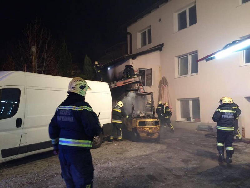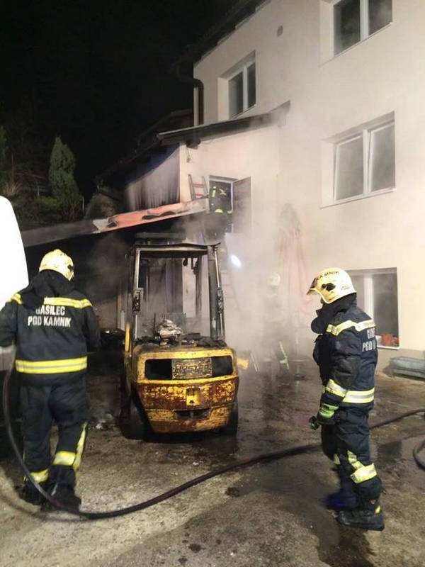 Kamniški gasilci so bili sinoči, ob 20.54, obveščeni, da je na Žebljarski prišlo do požara v skladišču pri nekdanji tovarni gumbov Svit. Gasilci so na prizorišče požara prišli s tremi cisternami in ekipo sedemnajstih gasilcev, ki so ob prihodu nemudoma začeli z gašenjem gorečega viličarja ter nadstreška.