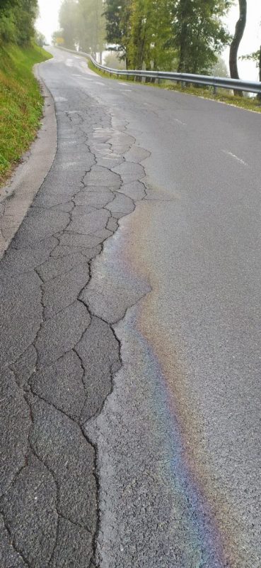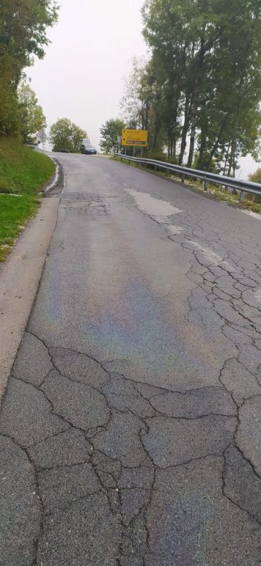 Naš bralec nam je pred nekaj trenutki poslal fotografije in sporočilo, da se na regionalni cesti Stahovica – Gornji Grad, pred odcepom za Kranjskega Raka, nahaja večji oljnji madež, ki na že tako uničenem cestišču predstavlja še dodatno nevarnost za za voznice in voznike ter tudi za okolje, saj se z oljem onesnažena meteorna voda steka na travnik oz. pašnik pod cestiščem.