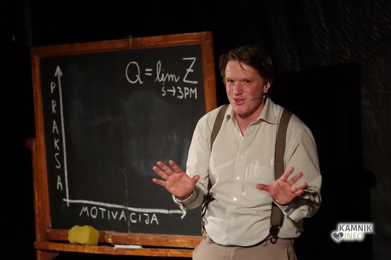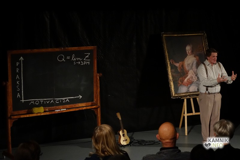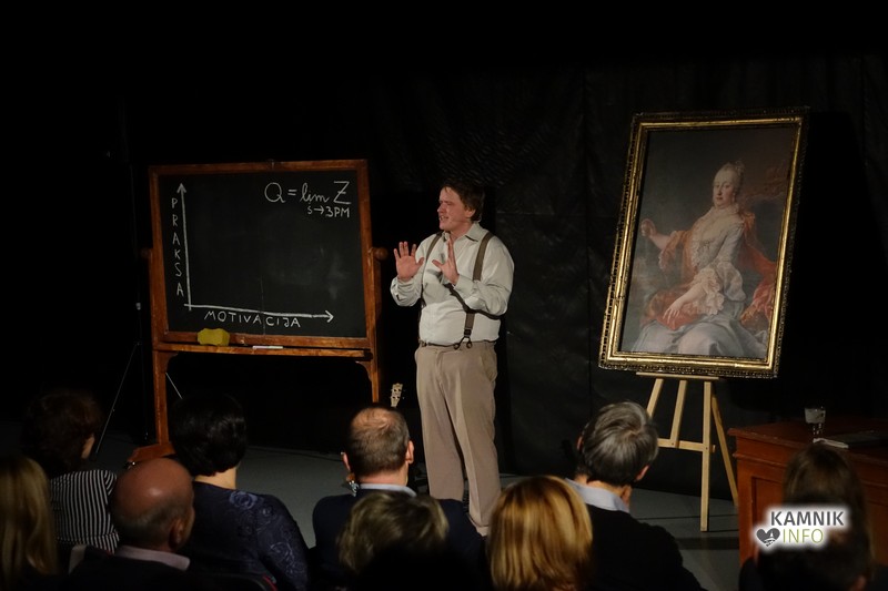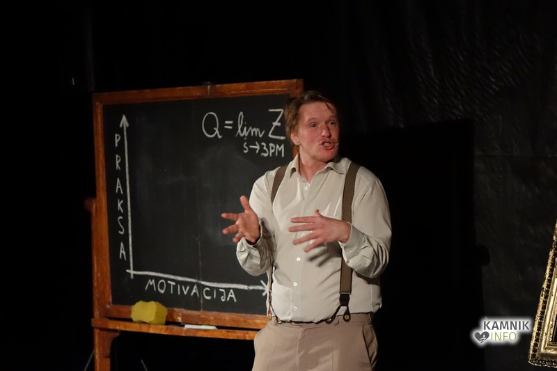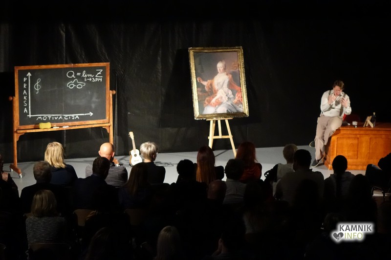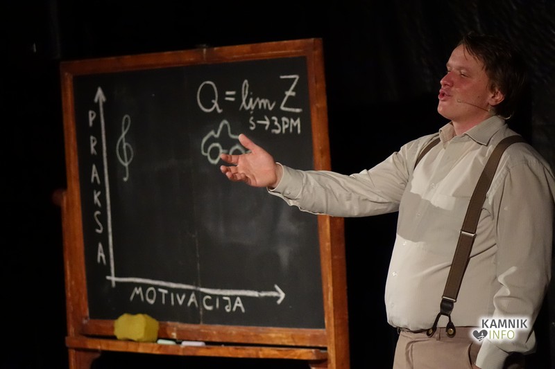 Po kratkem kulturno literarnem uvodu pa je na oder že stopil Uroš Kuzman s svojo mono-komedijo Profesor Kuzman mlajši, v kateri je s publiko delil svoje spomine na šolanje, delil pa je tudi svoje malce novejše izkušnje, saj je Kuzman namreč čisto pravi in zaresni profesor (asistent profesorja) matematike!
