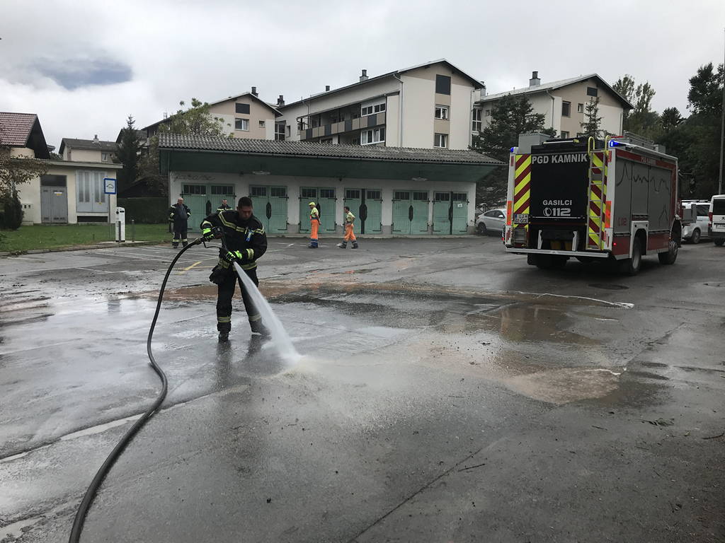 Okoli 9.30 so bili gasilci PGD Kamnik obveščeni, da je pri Domu kulture Kamnik razlito hidravlično olje. Ob prihodu na kraj so ugotovili, da je olje pomešano z vodo, zato so oljni madež najprej nevtralizirali, nato pa poskrbeli še za njegovo odstranitev in očiščenje okolice.