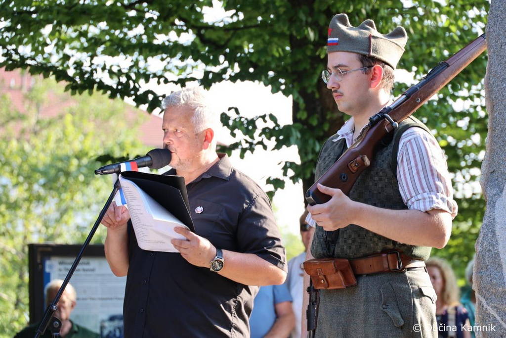 Zbrane je pozdravil in nagovoril tudi župan Matej Slapar, ki je dejal, da se na ta dan spominjamo tistih, ki so dali za našo domovino največ, dali so svoja življenja, na nas pa je, da živimo v sobivanju, da spoštujemo eden drugega, in da naredimo vse, kar je v naši moči, da do krutih dogodkov, ki se dogajajo v vojnah, ne pride več. Obenem je dodal še, da je Občina Kamnik lani očistila in obnovila spomenik, ter uredila okolico, za kar je bilo namenjenih in porabljenih slabih 2.000 evrov.