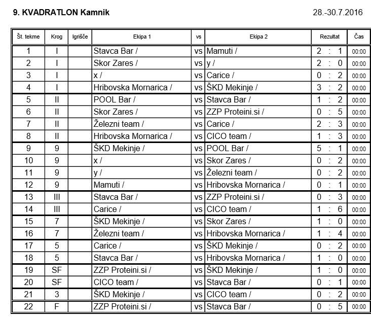 Kar nekaj tekem se je končalo šele po streljanju kazenskih strelov, največ sreče pa so imeli igralci ekipe Stavca bar, ki se jim je odprlo šele v finalu, ko so nadigrali ekipo ZZP Proteini.si. V tekmi za tretje mesto so bili od ekipe ŠKD Mekinje boljši igralci Cico teama. Peti so bili Hribovska mornarica, presenečenje turnirja so bile Carice na šestem mestu, sedma je bila ekipa Skor zares, osma Železni team, deveti Mamuti in deseti Pool Bar.