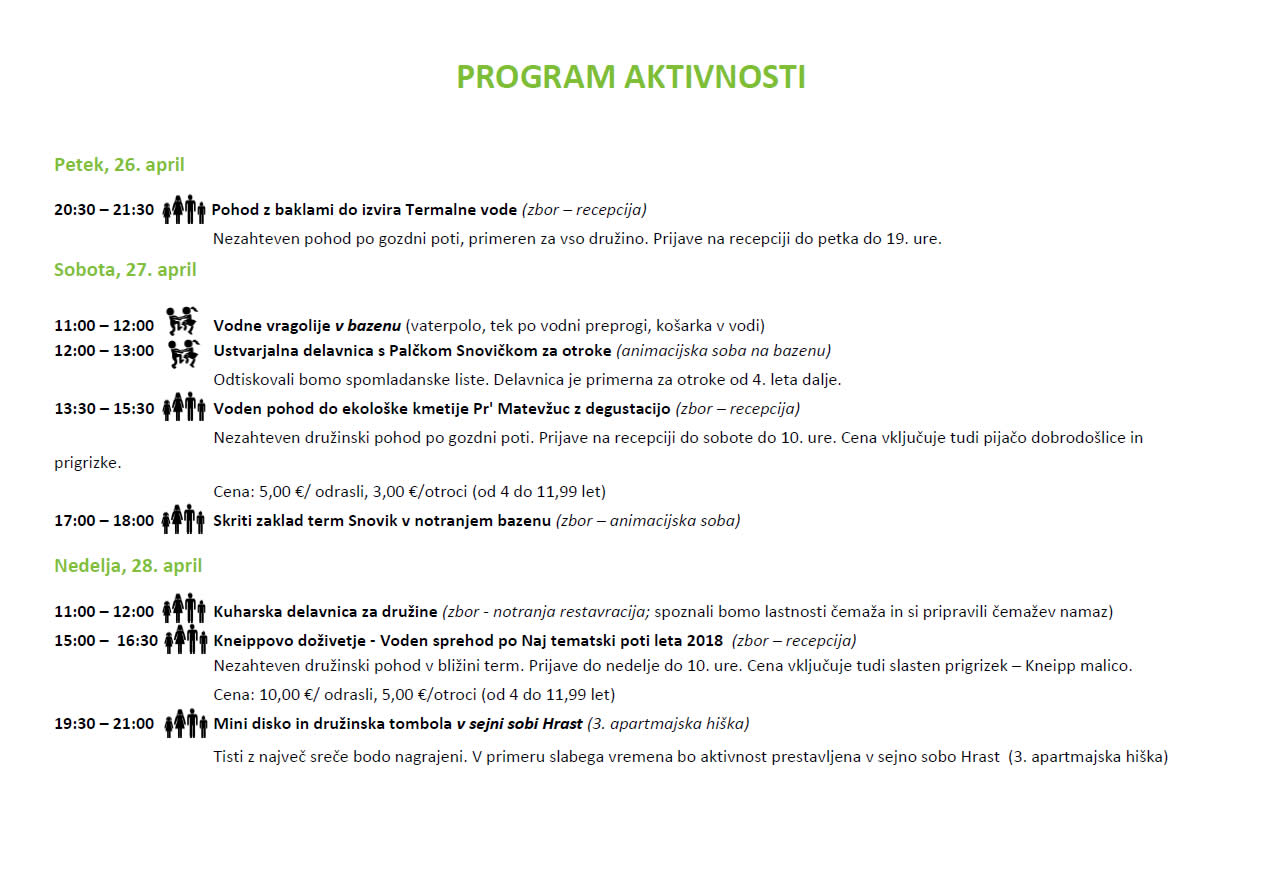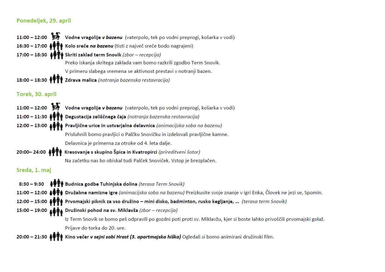Vodne vragolije v bazenu, kresovanje in zabava s skupinama Špica in Kvatropirci, budnica Godbe tuhinjska dolina, prvomajski piknik za vso družino, organizirani pohodi v okolico in še marsikaj. Izberite svoja doživetja is si ustvarite nepozaben dan, v katerem uživa vsa družina.