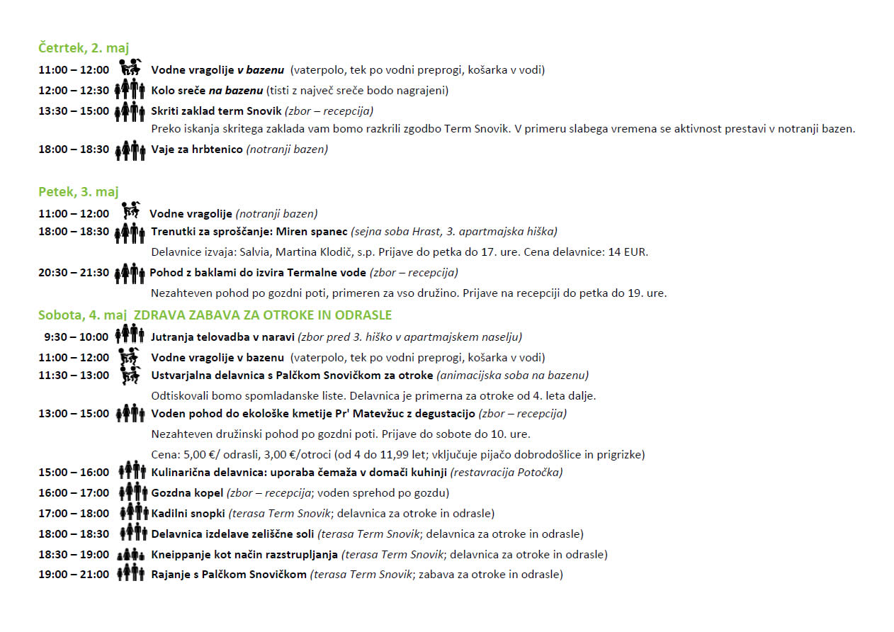 Iščete idejo, kako bi preživeli prvomajske počitnice? Terme Snovik poleg kopanja in wellnessa v času počitnic ponujajo zabavne aktivnosti za vso družino, ne glede na to, ali bo zunaj padal dež ali sijalo toplo pomladno sonce.