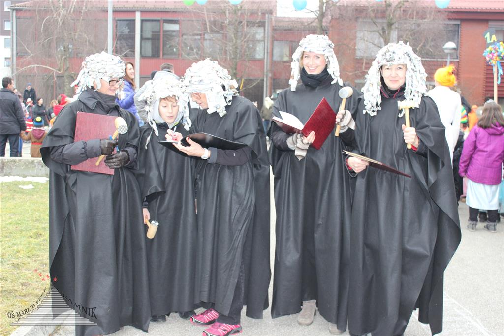 Sprevod se je končal pred šolo, kjer smo se posladkali s krofi in sokom ter razglasili najlepše in najbolj domiselne pustne maske. Strokovno komisijo, našemljeno v sodnike, so sestavljali učitelji, učenec in predstavnik staršev.