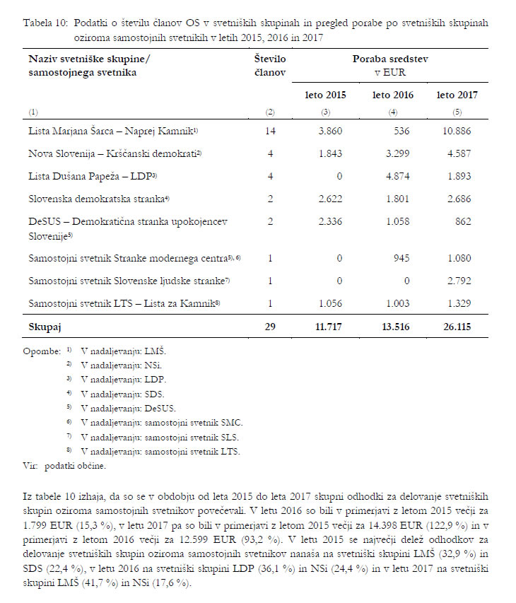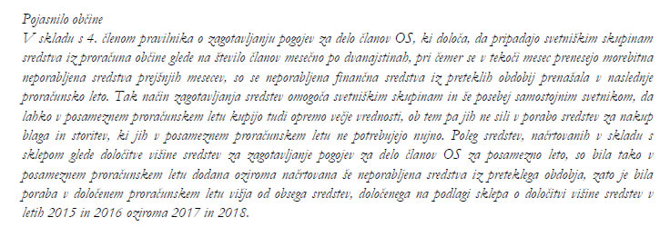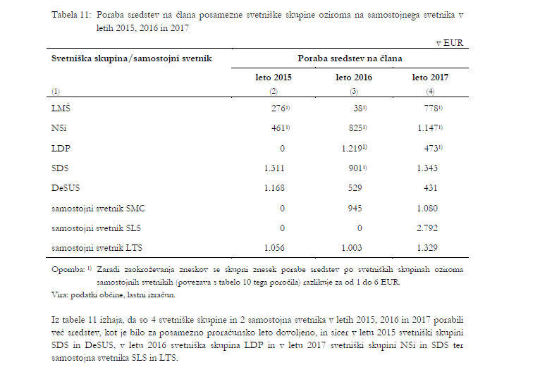 - izplačala je več sredstev za zagotavljanje pogojev za delo članov svetniških skupin, kot je bilo dopustno (v obdobju od leta 2015 do leta 2017 izplačano skupaj 3.946 EUR preveč); plačala je račune za zagotavljanje administrativne in strokovne pomoči svetniškima skupinama in samostojnemu svetniku v skupnem znesku 12.389 EUR, kar je skladu z veljavno zakonodajo naloga občinske uprave;