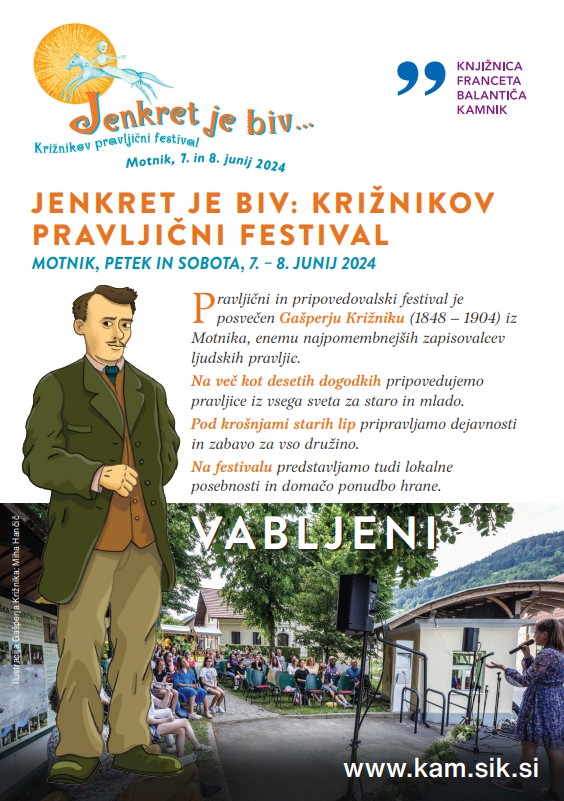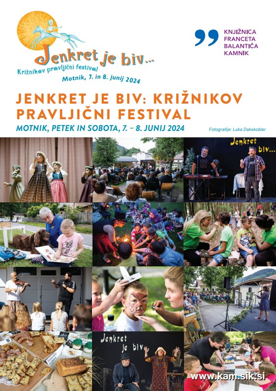 V soboto, 8. 6., se bomo dopoldne na Trojanah družili z Boštjanom Gorencem, popoldne pa se spet dobimo v Motniku. Na dogodku z naslovom Modrost iz roda v rod bomo ob poslušanju pravljic o modrosti podelili nagrade za najboljša dela likovnega natečaja z istim naslovom, sledili bodo nastopi učencev in učenk POŠ Motnik, Plesnega kluba Šinšin, lutkovnega gledališča Zapik in koncert Luke Ovsa ter Šmentanih muh. Že tradicionalno pripovedujejo tudi domačini, tokrat nam pripravljajo dogodek z naslovom Jenkret je biv en stari Križnik, na katerem pa bodo nastopili tako zelo mladi kot malo starejši pripovedovalci in pripovedovalke.