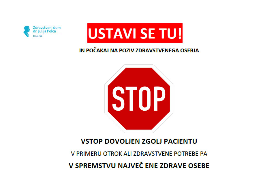 Če sumite, da ste zboleli zaradi okužbe s koronavirusom, vas prosimo, da ne prihajate in ne vstopate v Zdravstveni dom, ampak pokličite po telefonu svojega osebnega zdravnika, ob njegovi odsotnosti pa 01 8318 600 ali 01 8318 715.