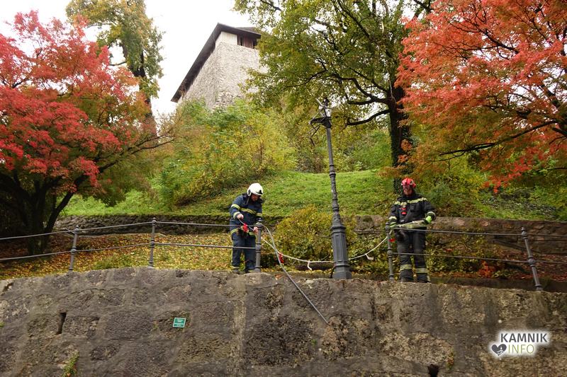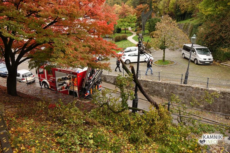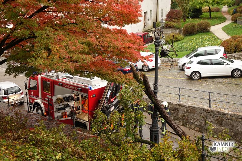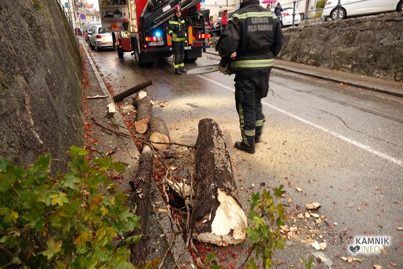 Danes dopoldne bi v samem središču Kamnika lahko kaj kmalu prišlo do tragedije, saj se je s starega drevesa, ki raste na pobočju pod stražnim stolpom na Malem gradu, odlomila večja, nekaj sto kilogramov težka veja, ki je padla na spodaj ležečo ulico.
